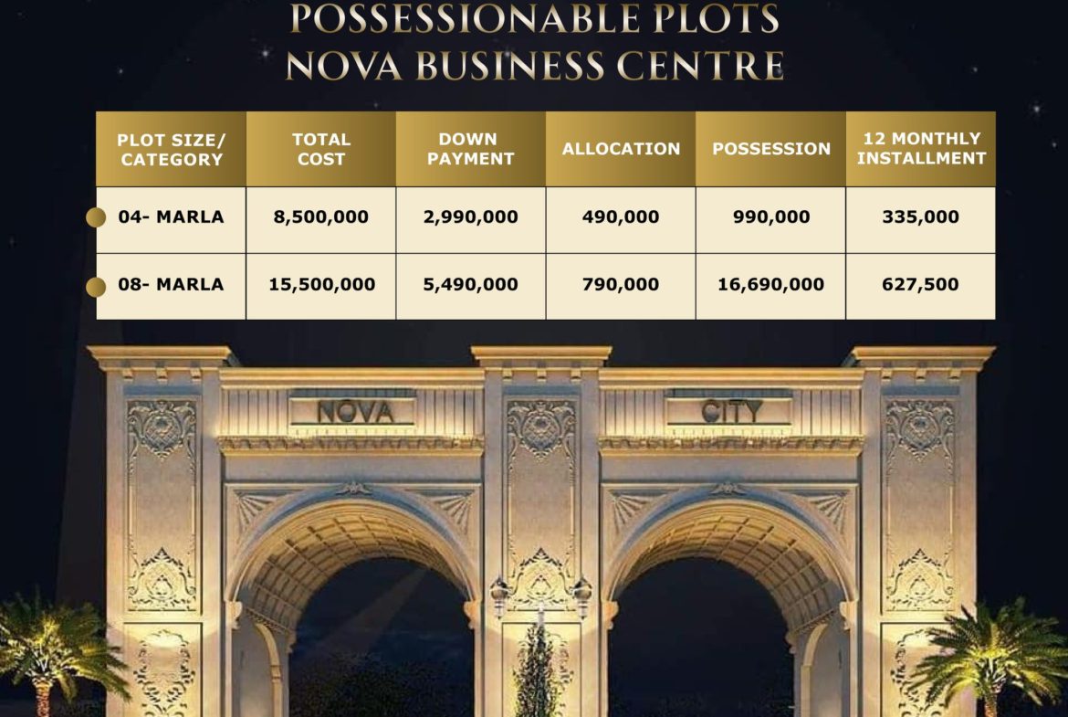 Get 4 & 8 Marla Possessionable Plots in Nova Business Centre on 1 year Installment Plans.